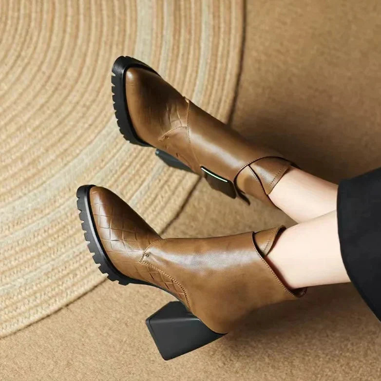 Bold yet refined, these ankle boots showcase a sleek vegan leather upper with sharp paneling and sculpted structure. Finished with a pointed toe, an eye-catching wrap strap, and a statement block heel, they bring instant edge to any modern wardrobe.
