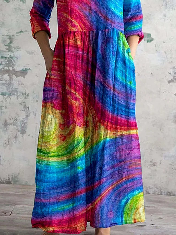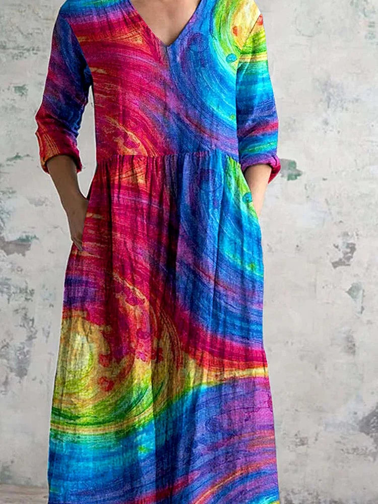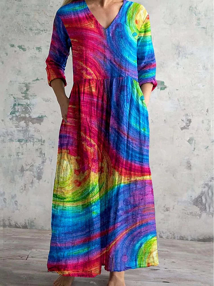 Women's V-Neck Rainbow Gradient Pattern Dress With Pockets